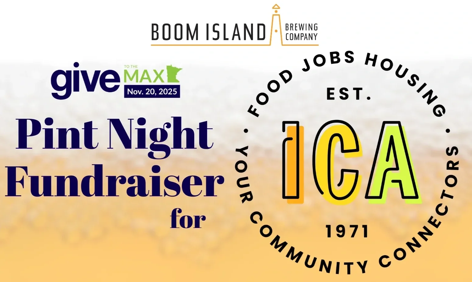 Participate in Give to the Max Day at Boom Island Brewing! For every pint sold between 4pm-8pm, Boom will donate $1 to ICA. Trivia will begin at 6:30pm and is free to play. For more information, visit https://boomislandbrewing.com/event/pint-night-fundraiser-ica-food-shelf/.